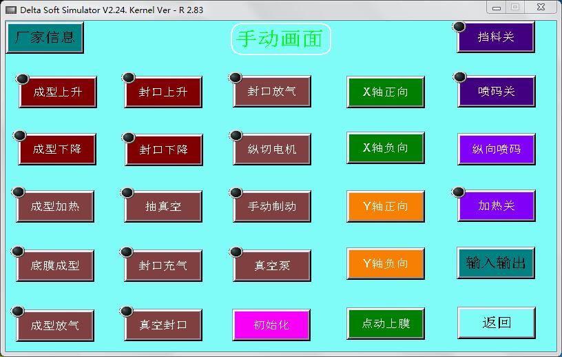 拉伸膜真空包裝機(jī)【手動(dòng)畫面】主要用于機(jī)器的手動(dòng)操作,有【廠家信息】【輸入輸出】?jī)蓚€(gè)切換畫面,有【加熱開】【噴碼開】【擋料開】三個(gè)開關(guān)鍵和一個(gè)【初始化】按鍵。還有【成型上升】【成型下降】等二十個(gè)點(diǎn)動(dòng)觸摸鍵。如下圖:
